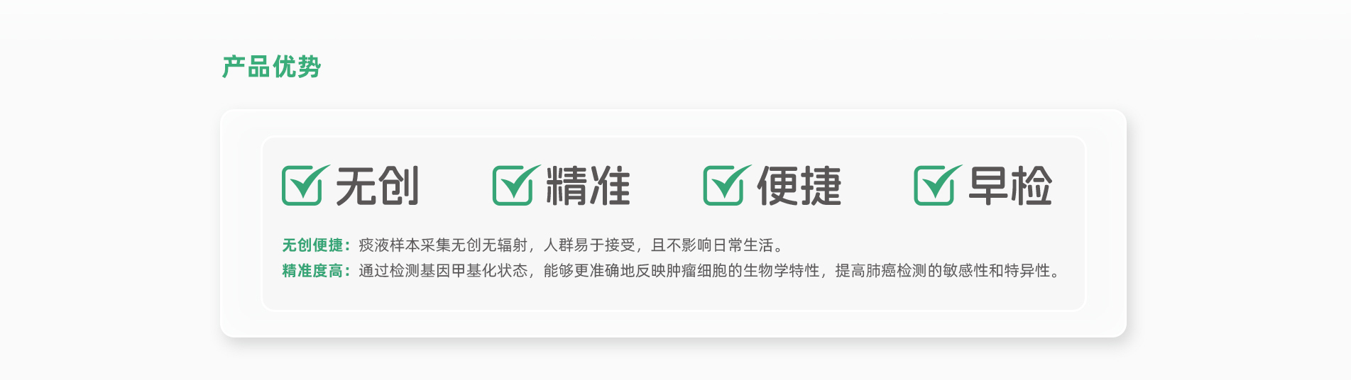 会安心®人类HOXB4、SRCIN1基因甲基化检测试剂盒(荧光PCR法)于2025年5月29日正式获批上市,这是首个痰液肺癌甲基化检测试剂盒。 会安心®通过解读痰液中脱落肿瘤细胞的基因异常改变(人类HOXB4、SRCIN1基因甲基化)进行肺癌的早期检测,帮助发现患者早期肺癌病变情 况, 有希望将肺癌阻断在早期阶段,从而达到提前预防和治疗肺癌的目的。